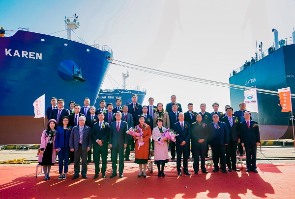 11月10日上午,新时代造船公司东区码头区域,彩旗飘飘,乐声阵阵,26#27#50000吨IMO Ⅱ型油化品船命名暨交付仪式隆重举行,新时代造船公司总经理刘海金、副总经理袁衡与船东山东海运股份有限公司董事长于冰、副总经理徐涛;工银金融租赁有限公司航运事业部副总经理赵阔;中国船东互保协会总经理宋春风;挪威船级社全球副总裁陈铿;圣母贺莉女士、许丽女士等嘉宾共同出席活动。新时代造船公司常务副总经理张玉永主持仪式,圣母贺莉女士、许丽女士将26#27#50000吨IMO Ⅱ型油化品船分别命名为“Ruo Yun”轮、“Karen”轮,并掷香槟礼。
