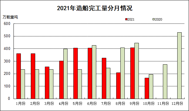 1~10月,50家重点监测的造船企业完工出口船2989万载重吨,同比增长7.6%;承接出口船订单5512万载重吨,同比增长208.4%;10月末手持出口船订单8645万载重吨,同比增长36.3%。出口船舶分别占重点造船企业完工量、新接订单量、手持订单量的95.7%、91.8%和89.5%。