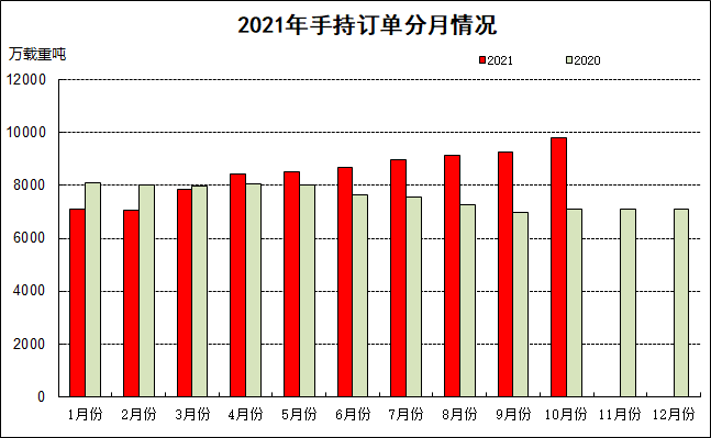 1~10月,全国造船完工3201万载重吨,同比增长5.0%。承接新船订单6149万载重吨,同比增长210.5%。10月底,手持船舶订单9810万载重吨,同比增长38.2%,比2020年底手持订单增长37.9%。