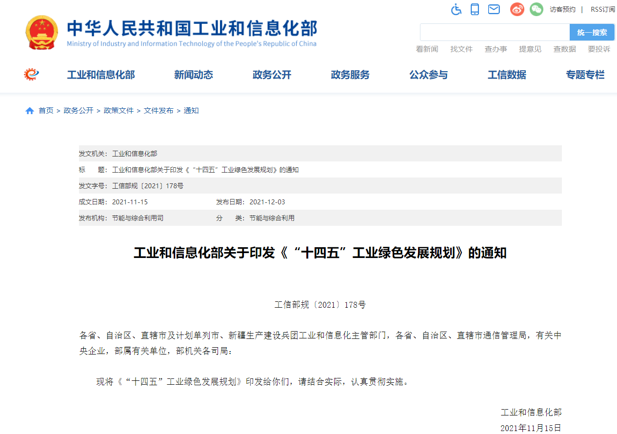 工信部发布《“十四五”工业绿色发展规划》
