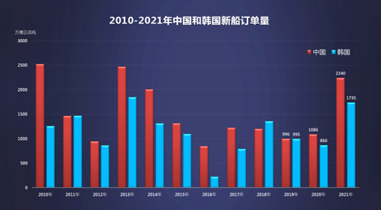近日,英国克拉克森研究公司发布了2021年初步统计数据,中国新船承接2280万修正总吨(CGT),以近50%的市场占有率位居世界第一。与此同时,根据中国船舶工业行业协会1-11月统计数据显示,中国承接新船订单2240万修正总吨,已经远超韩国全年1735万修正总吨,确定了2021年全年新船订单总量第一名的位置。从历史的角度来看,以修正总吨计,自2008年中国新接订单成为世界第一以来,除2011年和2018年略低于韩国外,其余年份中国新船订单始终保持世界第一,2019年以来更是实现了全球接单量的“三连冠”。