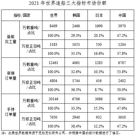 2021年,全国造船完工量3970.3万载重吨,同比增长3.0%,其中海船为1204.4万修正总吨;新接订单量6706.8万载重吨,同比增长131.8%,其中海船为2401.5万修正总吨。截至12月底,手持订单量9583.9万载重吨,比2020年底手持订单量增长34.8%,其中海船为3609.9万修正总吨,出口船舶占总量的88.2%。