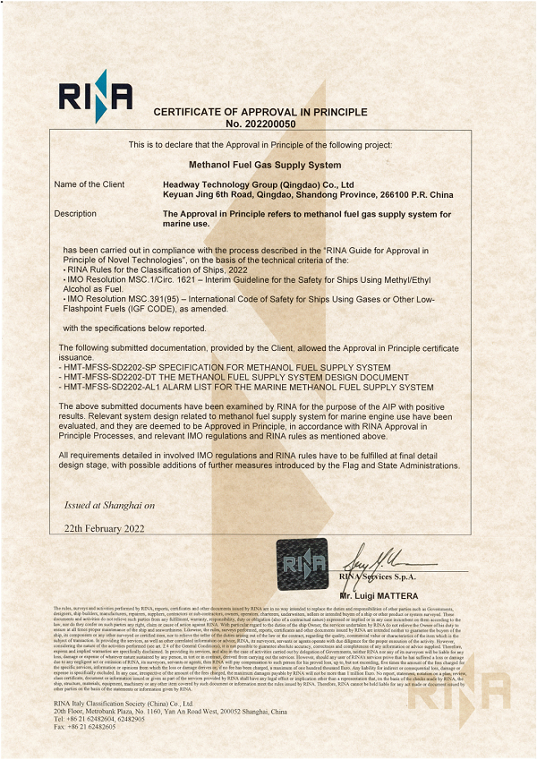 继LNG供气系统之后,海洋卫士®船用新燃料供给系统(FGSS)产品系列再添新军——日前,由海德威科技集团自主研发的海洋卫士®船用甲醇燃料供给系统,率先取得由意大利船级社(RINA)授予的原理认可证书(AIP),其核心过滤单元将采用海德威最新自主研发生产的高精度「双联滤器」。据介绍,目前该套系统的所有功能已完全符合船级社要求,实船安装指日可待。