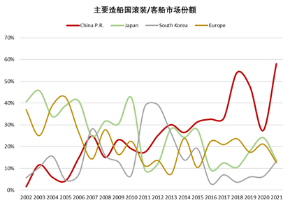 二是树立了除散货船以外的多型产品的领先优势。当前国际船舶市场需求按照大类可分为散货船、油船、集装箱船、气体船(包括LNG船和LPG船等)和滚装船(包括货物滚装船、客滚船、集滚船、汽车滚装船等)等五类。2021年,中国船厂承接散货船订单2978万载重吨,全球份额为77%;承接集装箱船订单235万TEU,全球份额为56%;承接滚装/客船订单116万修正总吨,全球份额为58%。五大类船舶中,中国船厂在其中三大类中的国际市场份额超过50%。散货船是国际造船市场需求量最大的船型,中国自2006年以来在散货船领域长期保持在50%以上的市场份额。散货船是中国船舶工业做大做强的产品基础,是保持行业规模和企业生产稳定性的“压舱石”。2012年后,在低迷的大环境下,中国造船企业开始了艰难的产品结构调整,在造船企业、设计院所、船配企业、金融机构的共同努力下,中国在集装箱船领域和滚装船领域的市场份额逐渐攀升,综合竞争优势逐渐凸显,形成中国船舶工业持续向好发展的新基础。