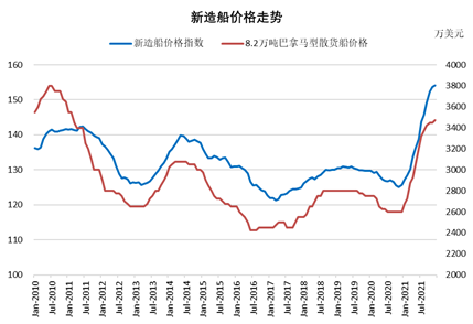 据克拉克森初步统计,2021年全球新造船成交量约1.2亿载重吨,同比增长78%,时隔6年再次突破1亿载重吨;按修正总吨和金额计,成交量和成交额分别为4664万修正总吨和1071亿美元,同比分别增长95%和113%。新造船价格指数达到154点,创出2009年底以来的最高水平,多数细分船型价格较2020年底上涨30%左右。