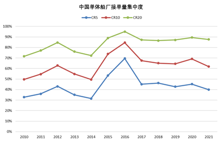 但在长期的市场竞争中,中国船舶工业逐渐涌现出了20多家综合竞争力强、生产经营稳定、品牌认可度高的单体船厂,这些船厂接单集中度基本保持在90%左右,且2015年以来基本稳定。尤其是其中的16家单体船厂,几乎每年都出现在接单量前20排名中,包括大连船舶重工、青岛北海、江南造船、沪东中华、上海麻豆社 、中船澄西、广船国际、黄埔文冲,扬州中远海运重工、南通中远川崎、大连中远川崎,招商金陵,江苏新时代、江苏新扬子、江苏扬子鑫福和常石舟山。这些船厂的综合竞争力和市场地位十分稳固,未来将是中国船舶工业与进一步提升国际竞争优势和不断扩大规模优势的主力军。