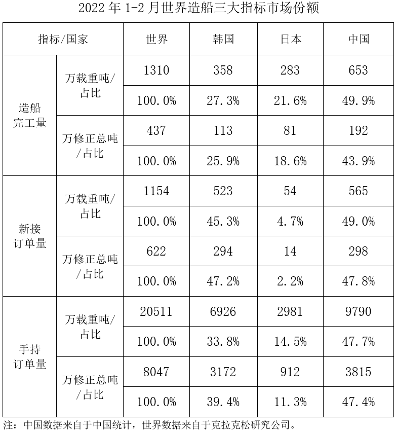 1~2月,我国造船完工量、新接订单量、手持订单量分别占世界市场份额的49.9%、49.0%和47.7%。