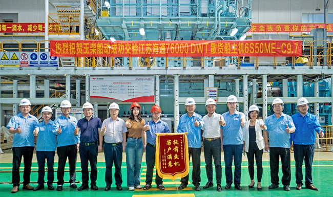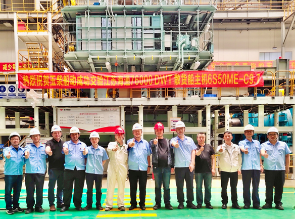 5月18日,玉柴船舶动力股份有限公司(简称:玉柴船动) 成功交验江苏海通海洋工程装备有限公司(简称:江苏海通)76000DWT 散货船6S50ME-C9.7主机,该机入级CCS,船东为安丰海运,该船东在江苏海通船厂所订造的散货船项目,全部选用玉柴船动主机。