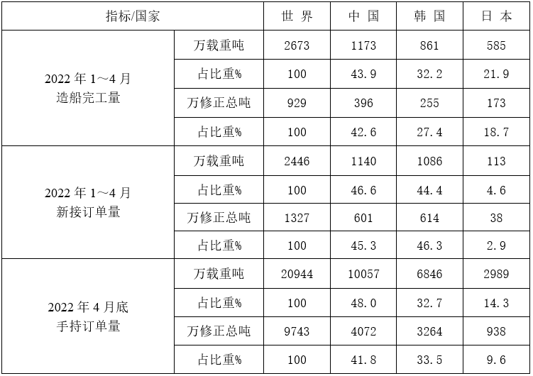 2022年1~4月份世界造船三大指标
