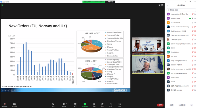 2022年6月23-24日,2022年日欧中韩美(JECKU)造船专家预备会(EPM)通过线上会议形式召开。本次会议由中国船舶工业行业协会(CANSI)主办,来自中国、日本、欧洲、韩国和美国协会及企业的32名专家代表通过视频连线的方式参加了会议。其中,中国代表团共有12名专家参会,分别来自中国船舶集团、中远海运重工、招商局工业、扬子江船业等企业及研究机构,李彦庆秘书长出席会议并致辞。