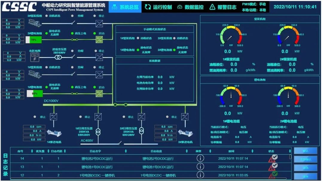 该系统区别于传统的交流配电PMS系统,采用单独成柜的方式,对全船动力能量源分配管理,同时具备电池和变频器监测控制、全船电能质量分析以及整船动力系统联合运行监控的功能,适用于电动船及直流混合动力船舶。