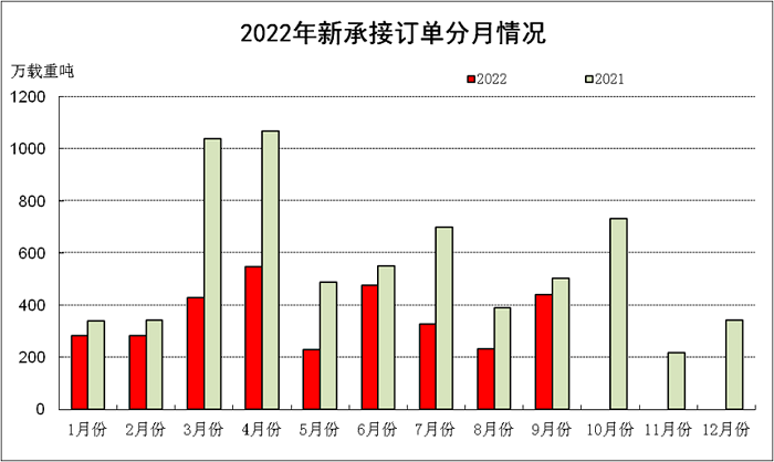 1~9月,50家重点监测造船企业造船完工2638万载重吨,同比下降10.8%。承接新船订单3048万载重吨,同比下降42.2%。9月底,手持船舶订单9947万载重吨,同比增长9.6%。