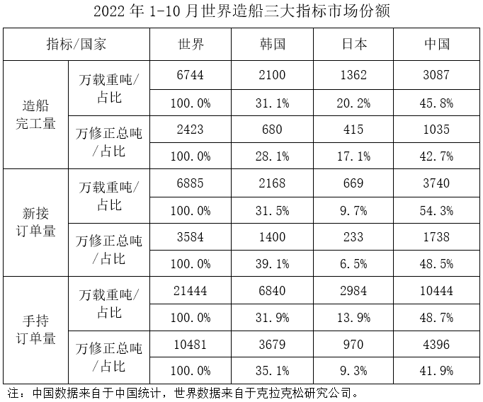 按修正总吨计,中国造船完工量、新接订单量、手持订单量分别占世界市场份额的42.7%、48.5%和41.9%。