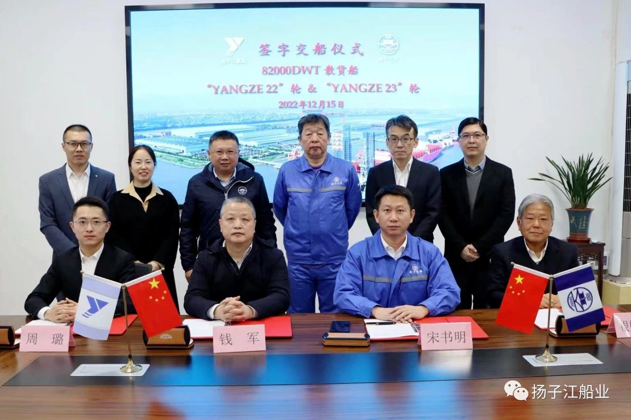 12月15日,扬子江船业集团扬子三井造船为扬子江航运建造的两艘82000DWT散货船“YANGZE 22”、“YANGZE 23”轮(挂利比里亚旗)顺利交付。扬子江航运总经理钱军先生,贸易公司周璐先生,扬子江船业集团副总经理兼扬子三井总经理宋书明先生、COO田村光路先生、CFO根桥秀州先生、副总经理陈国强先生、总经理助理中尾慎一先生等代表出席了签字交船仪式。