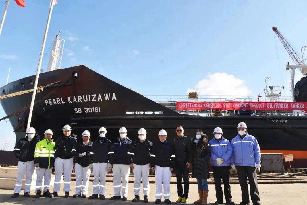 同日,京鲁船业为新加坡Consort Bunkers建造的7999DWT加油船“PEARL KARUIZAWA”轮的交船仪式和命名仪式成功举行。