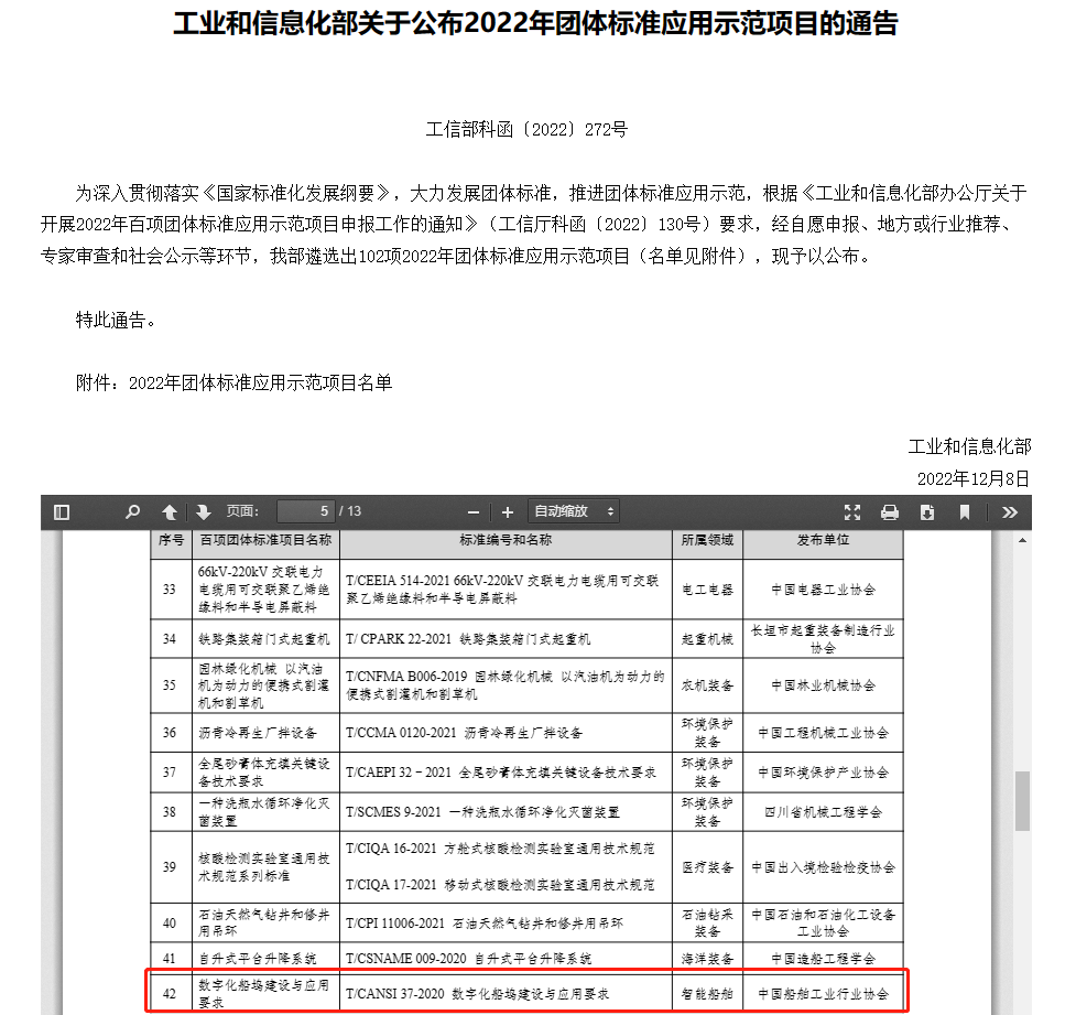 2023年1月11日,工业和信息化部发布通告,正式公布2022年团体标准应用示范项目名单,其中,由中国船舶工业行业协会选送的团体标准《TCANSI 37-2020 数字化船坞建设与应用要求》成功入选。