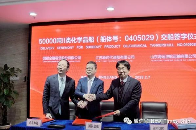 国银租赁船舶事业部执行董事熊剑锋表示:今天船舶的成功交付只是合作的开始,国银租赁将以坚定的态度,与优秀的船厂、优秀的伙伴合作,一定会创造出最优秀的合作模式,祝福新的船舶一帆风顺。山东海运副总经理徐涛表示:在这充满希望的春季,29#50000吨Ⅱ类化学品船成功交付见证了各方良好合作建立的深厚友谊,必将给各方带来丰硕的成果,让我们祝愿新船,也让新船见证我们的友谊。