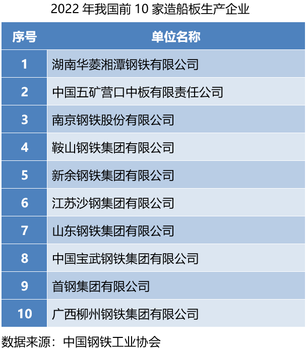 2022年,生产船板的钢铁企业达到18家,其中前十家企业船板产量达到1119万吨,同比增长34.8%,高强度板产量达到692万吨,同比增长37.3%。湖南华菱湘潭钢铁有限公司、中国五矿营口中板有限责任公司、南京钢铁股份有限公司、鞍山钢铁集团有限公司、新余钢铁集团有限公司和江苏沙钢集团有限公司造船板产量超过100万吨;山东钢铁集团有限公司造船板产量在去年大幅增长的情况下继续增长155%;沙钢、南钢和首钢高强度板产量占造船板比重均超过70%。