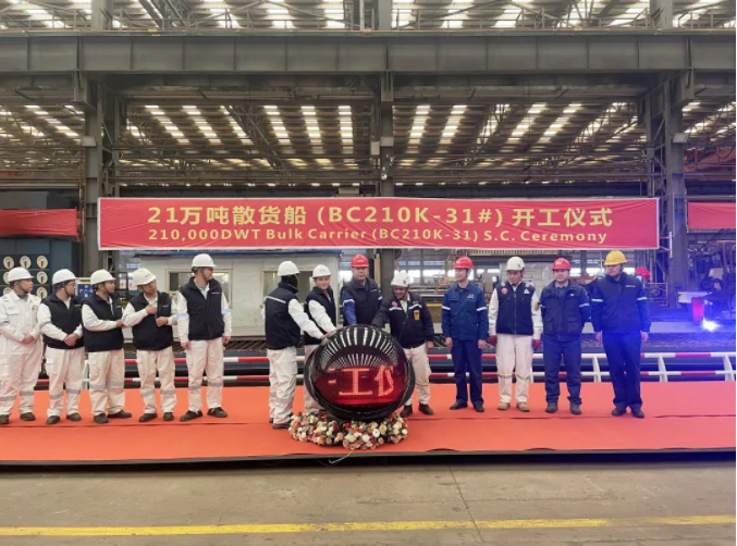 2月22日,中国船舶集团青岛北海造船有限公司承建的CMB 21万吨散货船“氨Ready”项目31号船在公司一区联合厂房四跨举行开工仪式。船东、船检代表与公司领导等各方汇聚台前,凝心聚力启动了水晶球,仪式取得圆满成功。