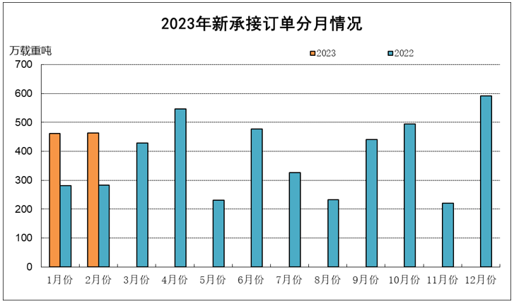 1~2月,48家重点监测造船企业造船完工383万载重吨,同比下降40.8%。承接新船订单925万载重吨,同比增长64.1%。2月底,手持船舶订单11057万载重吨,同比增长14.8%。