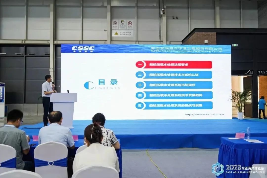 青岛双瑞海洋环境工程股份有限公司研发中心主任王廷勇介绍了船舶压载水处理法规要求、技术与系统认证以及市场现状等情况,并对技术发展趋势以及面临的机遇进行了分析。他表示,未来,压载水处理系统将出现技术不断优化、智能化云服务平台快速发展与应用、数字化智能制造技术加快应用等发展趋势。同时,由于港口国排放标准将会更加严苛,我国压载水处理行业需要加强应用技术研究,提升履约能力;进一步完善国内标准,积极参与国际标准制定,提升国际话语权;不断完善全球售后服务体系。