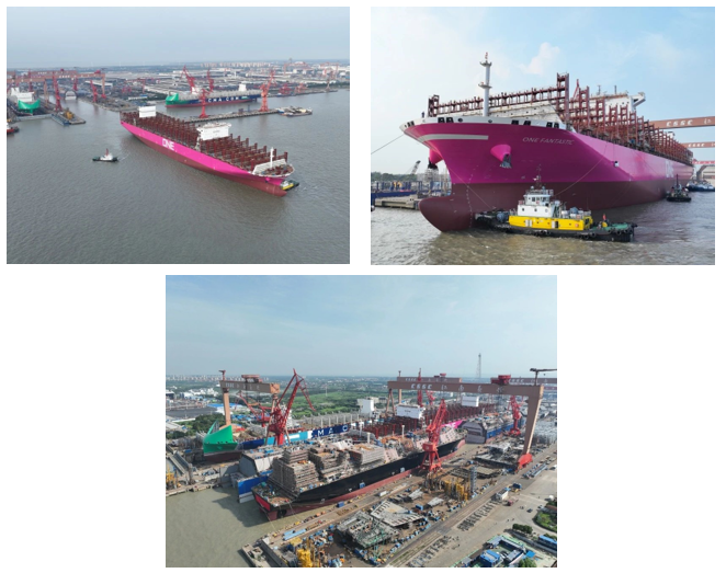 7月20日,中国船舶集团旗下沪东中华实现了一艘13000TEU液化天然气(LNG)双燃料动力大型集装箱船、一艘15500TEU常规动力大型集装箱船和一艘17.4万立方米大型LNG运输船同日入坞总装搭载三大生产节点。