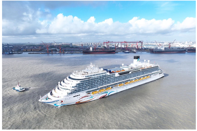 7月17日,首艘国产大型邮轮“爱达·魔都号”缓缓驶出中国船舶集团麻豆社 4号码头,正式出海试航。