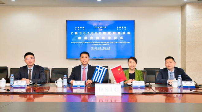7月14日,中国船舶集团旗下大连造船联合中船贸易与Dynacom Tankers Management 公司举行2艘30.7万吨超大型原油船建造合同线上签约仪式。