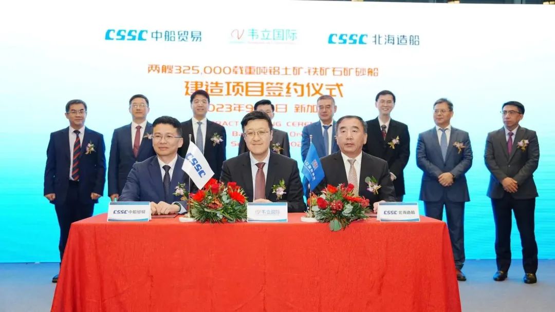 9月6日,中国船舶集团青岛北海造船有限公司联合中国船舶工业贸易有限公司与韦立国际集团在新加坡举行两艘32.5万载重吨矿砂船建造项目签约仪式。北海造船凭借其超大型矿砂船的丰富建造经验及先进的船型技术性能指标,获得韦立国际集团充分认可并促成项目签约。该项目也是韦立国际集团与中国船舶集团旗下船企的首次牵手合作。