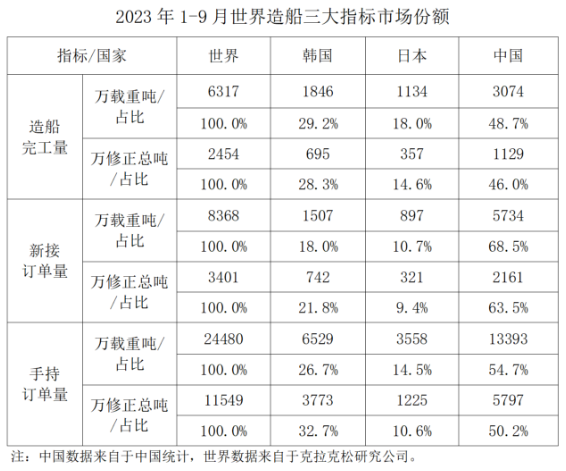 1~9月,我国造船完工量、新接订单量、手持订单量分别占世界市场份额的48.7%、68.5%和54.7%。
