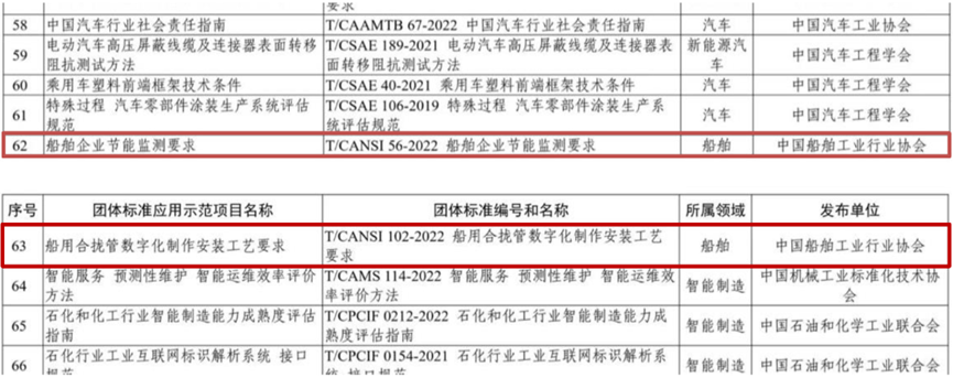 近日,工业和信息化部发布了2023年团体标准应用示范项目名单,中国船协批准发布的2项标准成功入选。两项团体标准分别为《T/CANSI56-2022 船舶企业节能监测要求》和《T/CANSI102-2022 船用合拢管数字化制作安装工艺要求》。