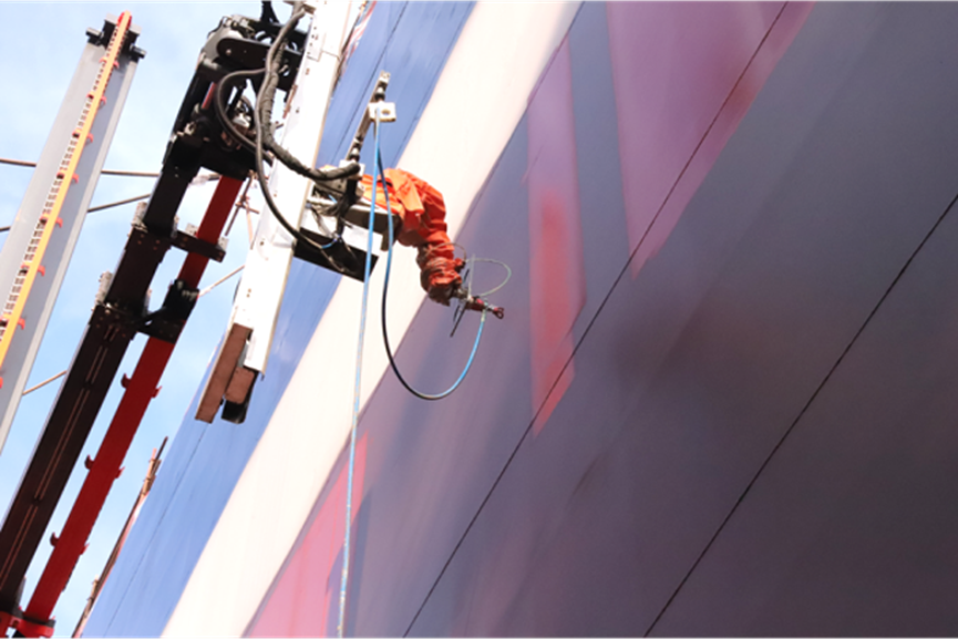 “象群”系列机器人的研制和应用,不仅使船舶外壳喷涂作业模式和作业品质发生了本质的改变,更重要的是大幅度降低了传统喷涂作业过程中涂料飞散入大气环境中的损耗。应用数据显示,涂料使用量较传统人工喷涂可节省近20%以上,相应可减少VOCs排放量以及碳排放量近20%以上,减少了涂料消耗成本及对环境的污染。同时,智能喷涂机器人作业可大幅降低作业人员劳动强度,施工品质不受作业人员技能的制约;作业后涂层膜厚均匀,可增强涂层附着力约30%,延长了涂层保护周期;增强了涂层表面光洁度,降低了涂层表面粗糙度约25%,降低了船舶航行阻力,可有效减少船舶燃油消耗,不仅为船东节省了船舶运营成本,同时也减少了碳排放量。