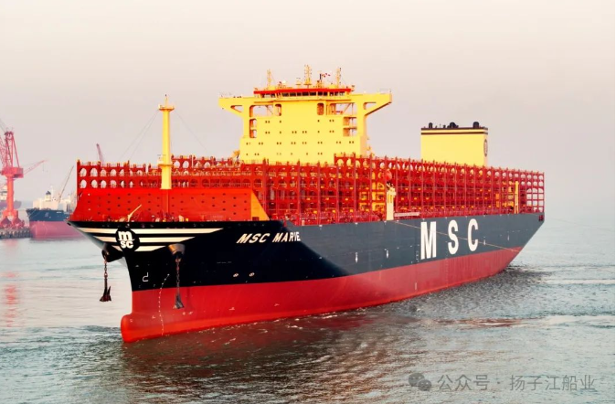 2月24日下午,扬子鑫福造船为SEASPAN建造的第四艘16000TEU集装箱船——“MSC MARIE”轮交付离厂,上线MSC船队运营。
