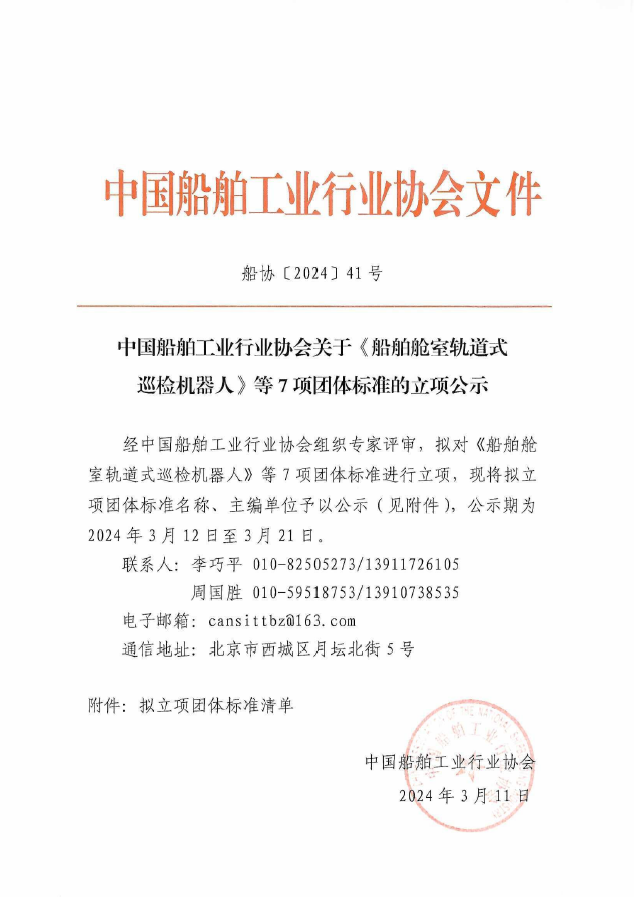 中国船舶工业行业协会关于《船舶舱室轨道式巡检机器人》等7项团体标准的立项公示