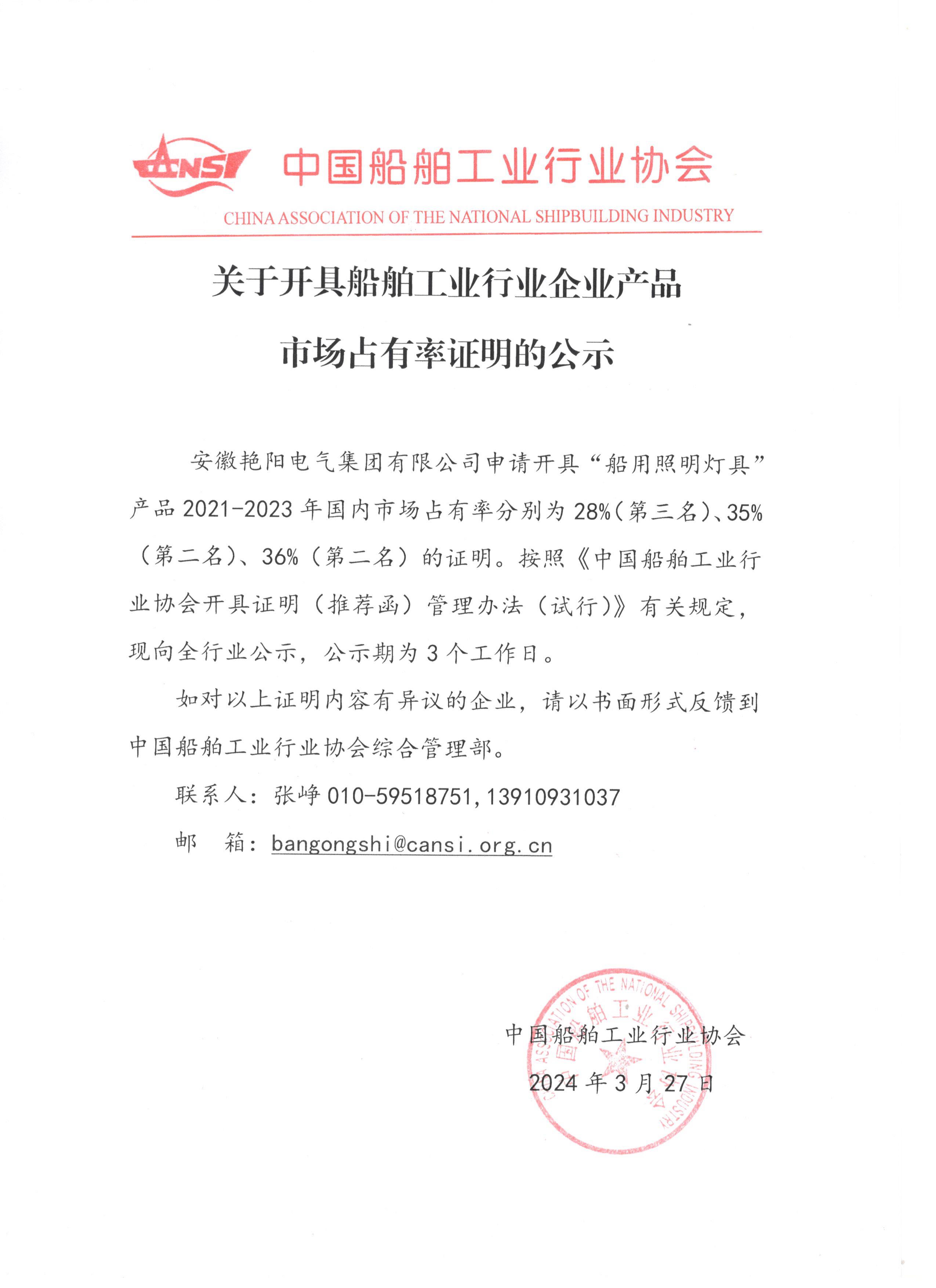 关于开具船舶工业行业企业产品市场占有率证明的公示
