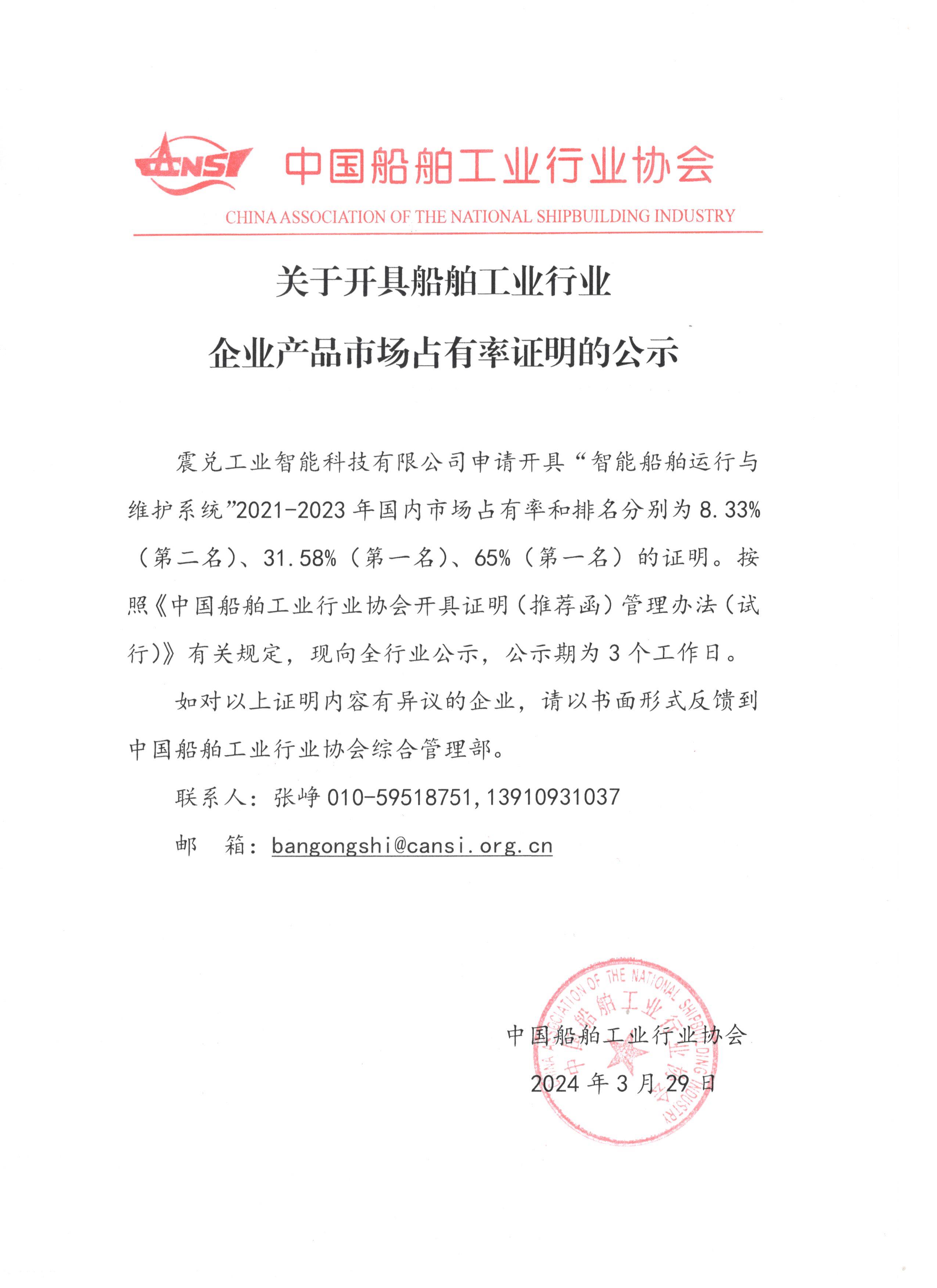 关于开具船舶工业行业企业产品市场占有率证明的公示