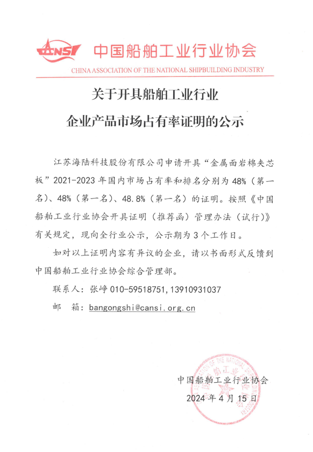 关于开具船舶工业行业企业产品市场占有率证明的公示