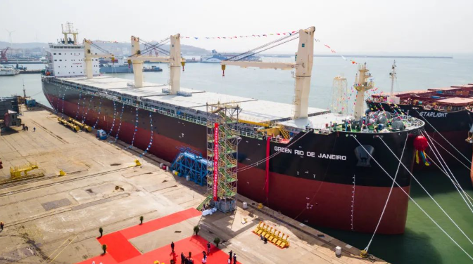 4月18日,大连中远海运重工为交银金租建造的系列77000吨多用途纸浆船 “GREEN RIO DE JANEIRO”轮举行交付命名仪式。该轮是大连中远海运重工建造的第四艘77000吨多用途纸浆船。