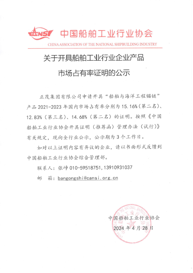 关于开具船舶工业行业企业产品市场占有率证明的公示
