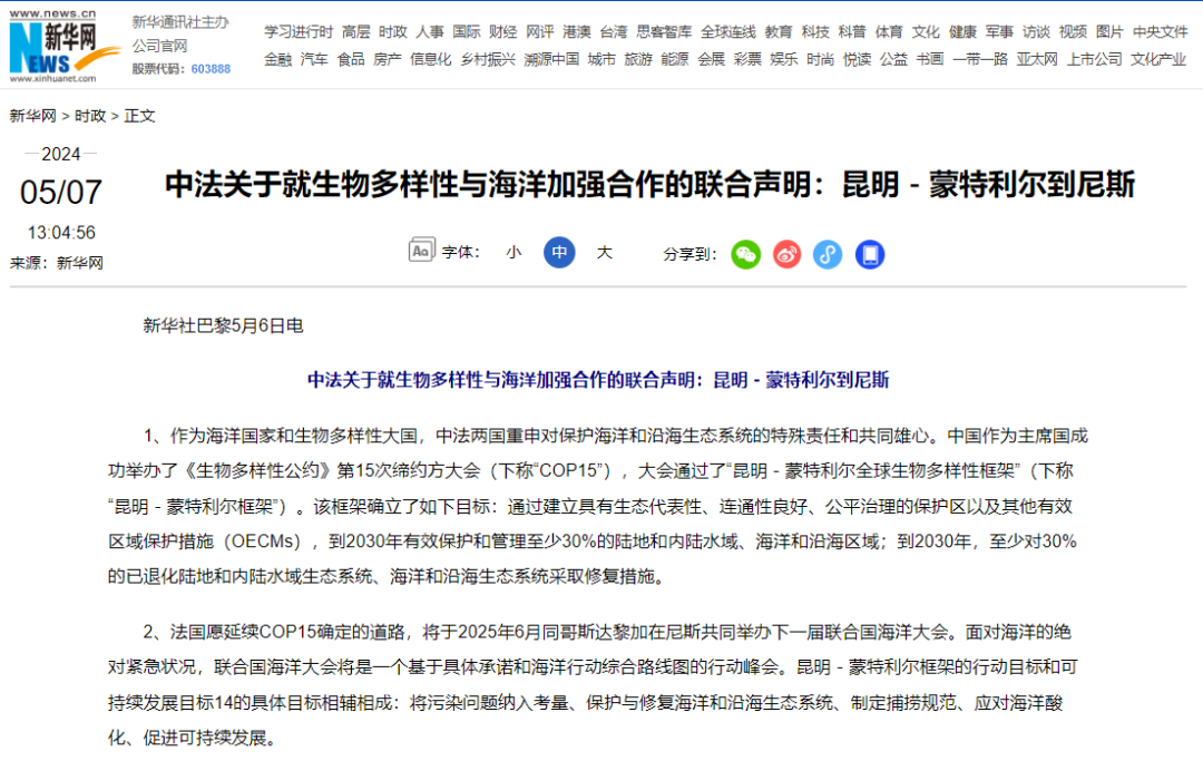 根据新华社5月7日正式发布的《中法关于就生物多样性与海洋加强合作的联合声明:昆明-蒙特利尔到尼斯》(简称联合声明),中法两国将在国际海事组织(IMO)框架下,通过全球协调的政策,共同做出努力,并研究技术和市场举措,推进航运业温室气体减排工作,增强可持续替代能源竞争力;并加强在蓝色经济领域以及可持续沿海旅游等方面的合作。