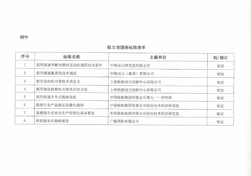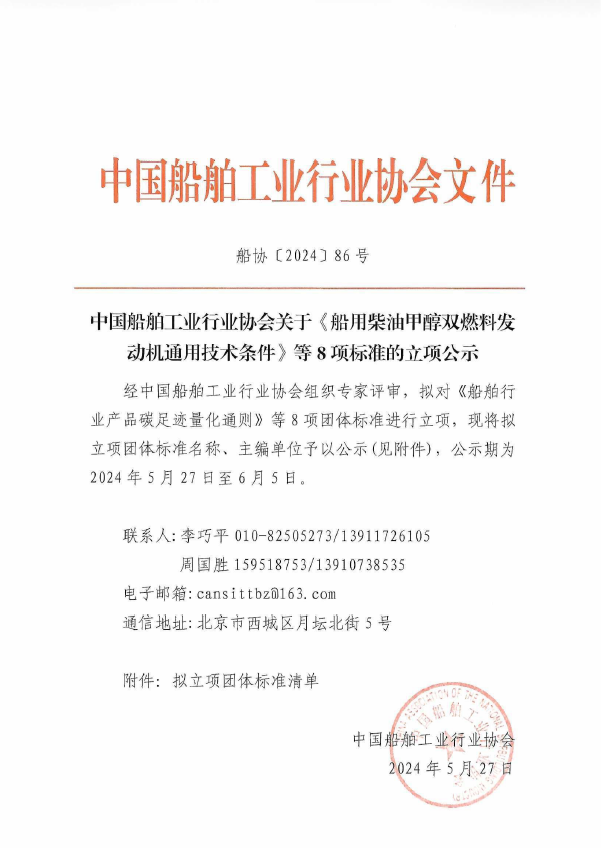 中国船舶工业行业协会关于《船用柴油甲醇双燃料发动机通用技术条件》等8项标准的立项公示
