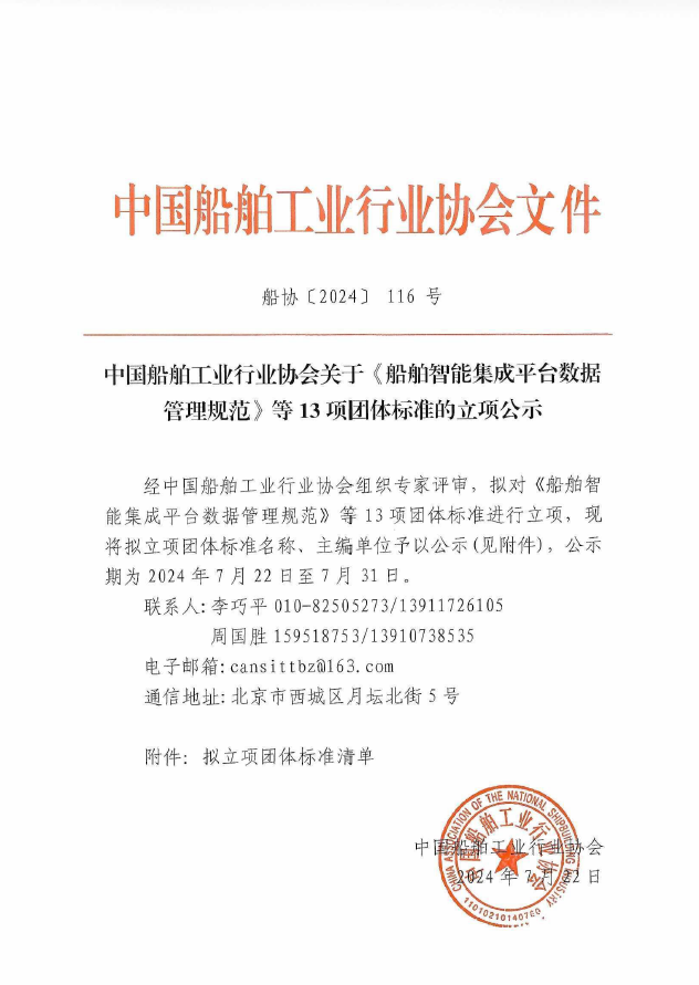 中国船舶工业行业协会关于《船舶智能集成平台数据管理规范》等13项团体标准的立项公示