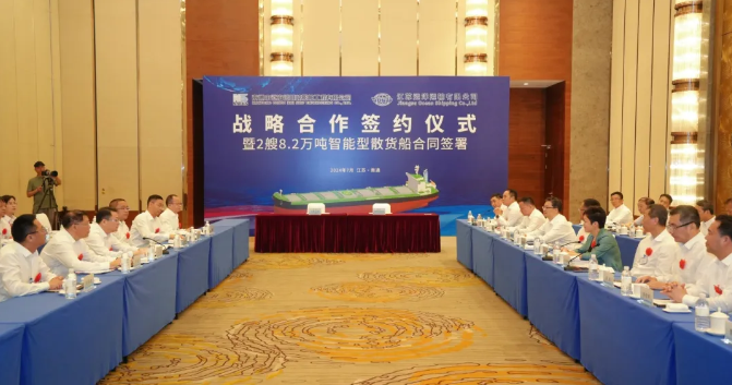 7月31日下午,江苏省港口集团旗下江苏远洋运输有限公司和中远海运重工旗下南通中远海运川崎船舶工程有限公司签署战略合作协议暨2艘8.2万吨智能型散货船合同。南通市委副书记、市长张彤,江苏省港口集团有限公司党委书记、董事长陈明,中远海运重工有限公司董事长、党委书记梁岩峰出席活动并致辞。