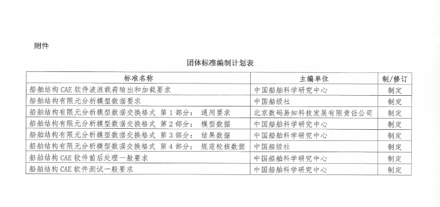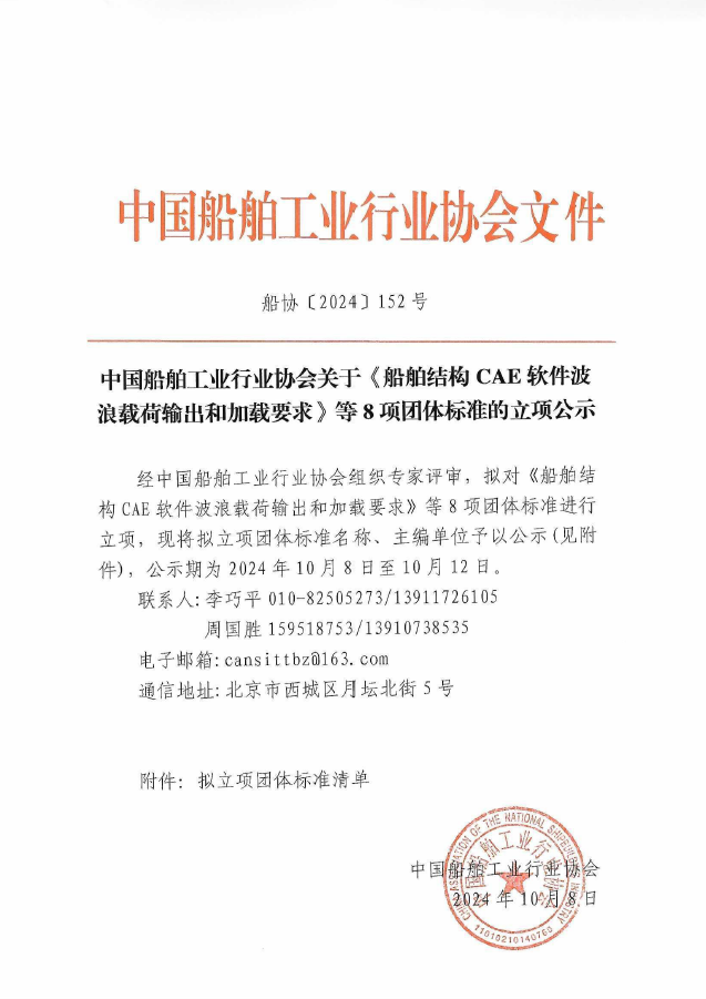 中国船舶工业行业协会关于《船舶结构CAE软件波浪载荷输出和加载要求》等8项团体标准的立项公示
