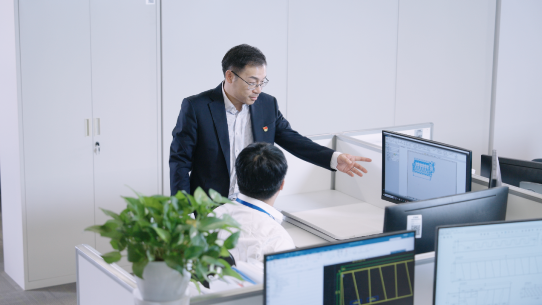 图:中船动力集团流程数字化中心副主任朱跃斌与工程师在交流