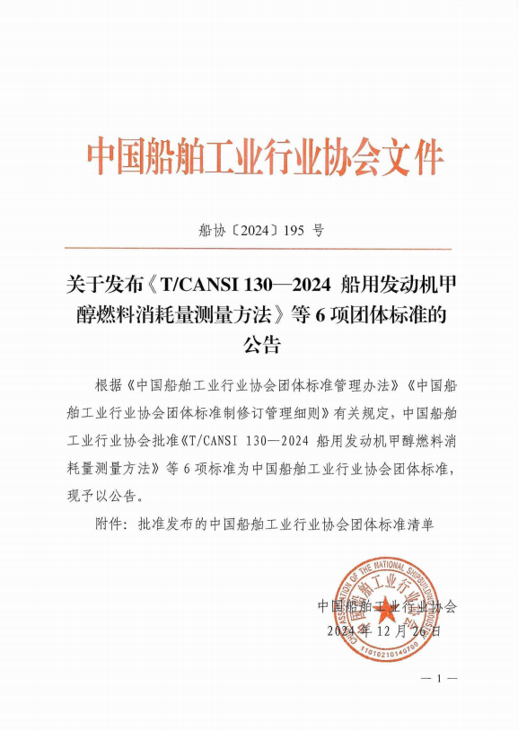 关于发布《T/CANSI130-2024船用发动机甲醇燃料消耗量测量方法》等6项团体标准的公告