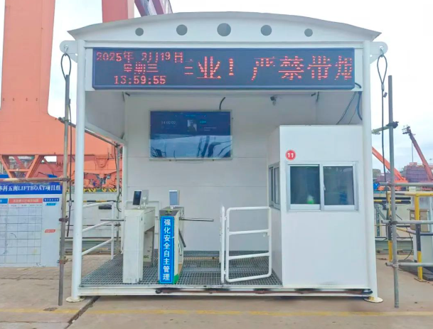 登轮闸口设施完备、功能齐全,集人脸识别、闸机通道、监控录像、值班保卫于一体,能有效杜绝闲杂人员违规登轮,保证施工作业人员安全通行。同时登轮看板以可视化方式实时呈现登轮人员数量、岗位人员资料、安全提示内容等关键信息,满足边防管理需求,可快速掌握登轮人员情况,协同作业更加高效。