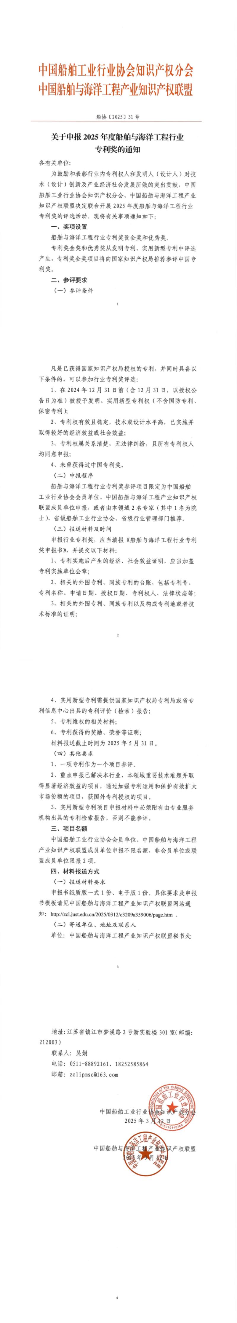 关于申报2025年度船舶与海洋工程行业专利奖的通知