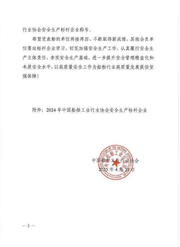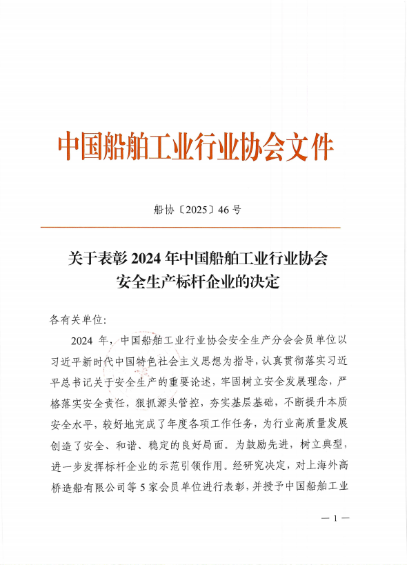 关于表彰2024年中国船舶工业行业协会安全生产标杆企业的决定