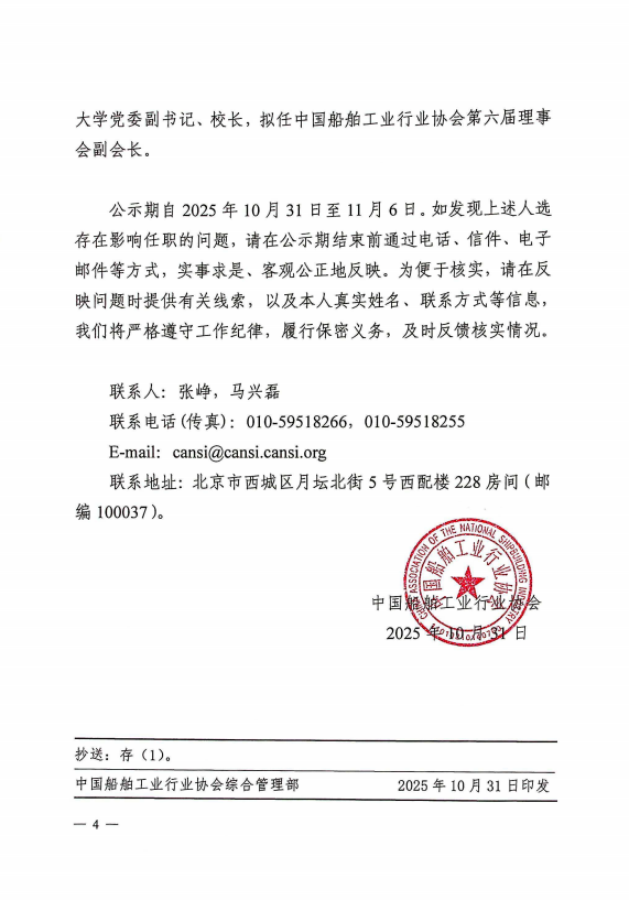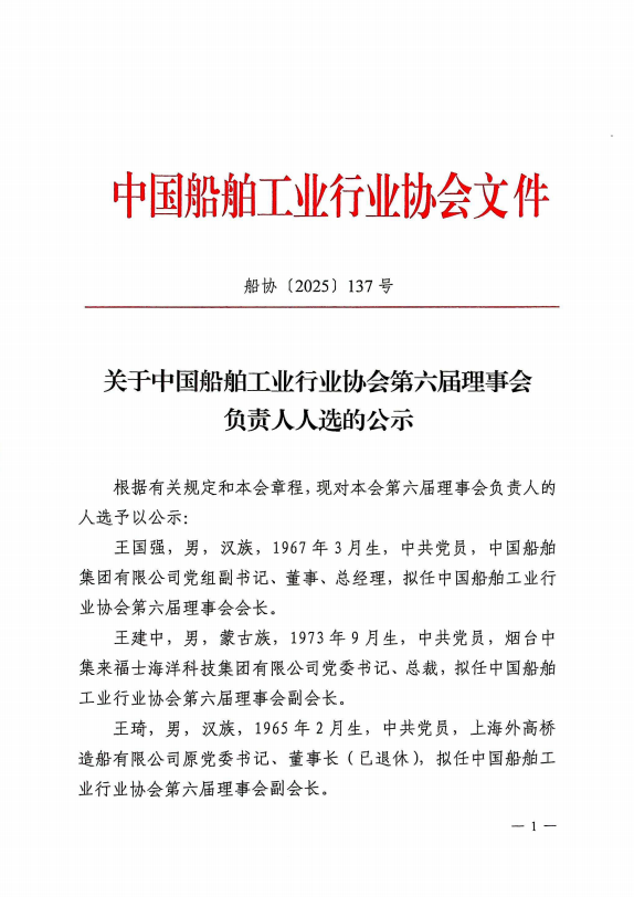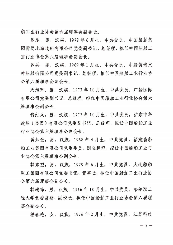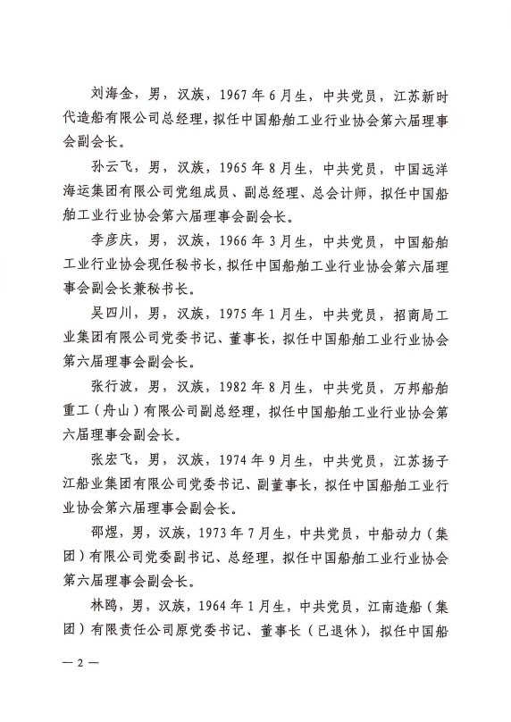 关于中国船舶工业行业协会第六届理事会负责人人选的公示